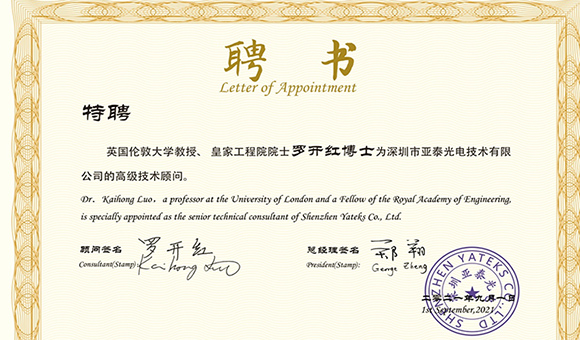 風勁帆滿海天闊,牽手闊步新征程!2021年9月1日,深圳市亞泰光電技術有限公司特聘英國倫敦大學教授、皇家工程院院士羅開紅博士為高級技術顧問。亞泰光電總經(jīng)理鄭翔為羅開紅博士頒發(fā)了聘書。