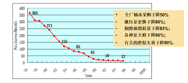 日本新日鐵公司在1980-1986年的六年間由于加強潤滑監測與管理,使設備失效率下降了65%。